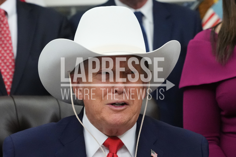 President Donald Trump tries on a cowboy hat, a gift from members of the 1980 U.S. Men's Olympic Hockey team, during a bill signing ceremony Friday, Dec. 12, 2025, in the Oval Office of the White House, in Washington. (AP Photo/Jacquelyn Martin) Associate Press/ LaPresse Only Italy and Spain