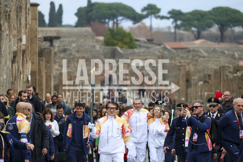 Pompei: December 22, 2025, Milan-Cortina 2026 Winter Olympics. The photo shows the Olympic torch passing through the Archaeological Park.