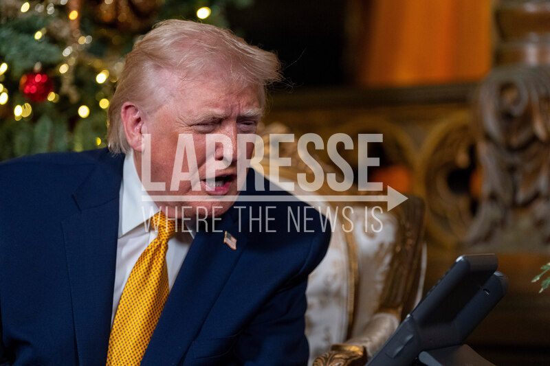President Donald Trump speaks during a NORAD, North American Aerospace Defense Command, Tracks Santa Operation call at his Mar-a-Lago club, Wednesday, Dec. 24, 2025, in Palm Beach, Fla. (AP Photo/Alex Brandon)