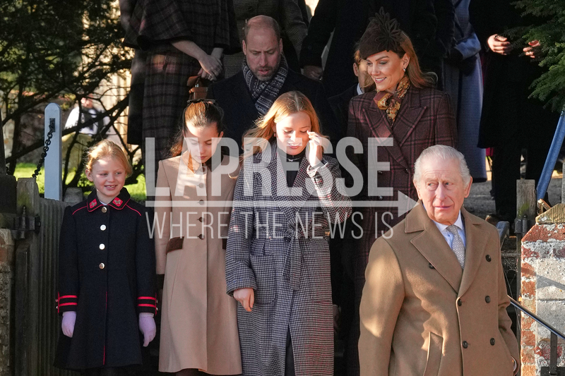 Britain's King Charles III, right, leaves with Lena Tindall, from left, Princess Charlotte, Prince William, Mia Tindall, and Kate, the Princess of Wales after attending the Christmas Day service at St Mary Magdalene Church in Sandringham, Norfolk, England, Thursday, Dec. 25, 2025.(AP Photo/Jon Super)