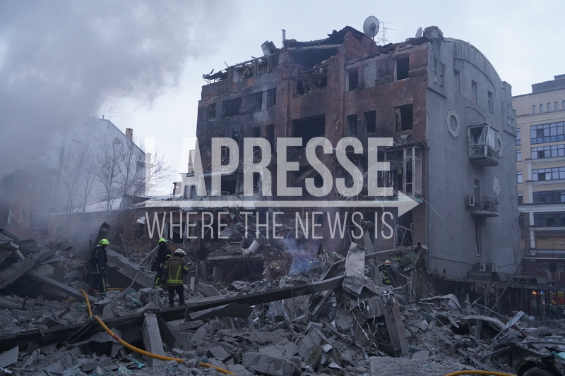 Emergency services personnel work to extinguish a fire following a Russian missile attack in Kharkiv, Ukraine, Friday, Jan. 2, 2026. (AP Photo/Andrii Marienko)