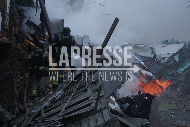 Emergency services personnel work to extinguish a fire following a Russian missile attack in Kharkiv, Ukraine, Friday, Jan. 2, 2026. (AP Photo/Andrii Marienko)