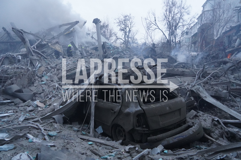 Emergency services personnel work to extinguish a fire following a Russian missile attack in Kharkiv, Ukraine, Friday, Jan. 2, 2026. (AP Photo/Andrii Marienko) Associate Press/ LaPresse Only Italy and Spain