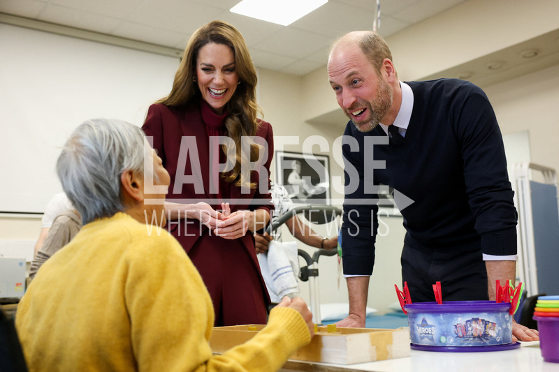 Britain's Prince William and Britain's Kate, Princess of Wales, speak to a patient at the therapy gym during a visit to Charing Cross Hospital, in London, England, Thursday, Jan. 8, 2026. (Isabel Infantes/Pool Photo via AP)