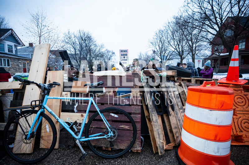 Barriers blocking off access to the street where a woman was fatally shot by an Immigration and Customs Enforcement officer the day before, is photographed in Minneapolis, Thursday, Jan. 8, 2026. (Christopher Katsarov/The Canadian Press via AP)