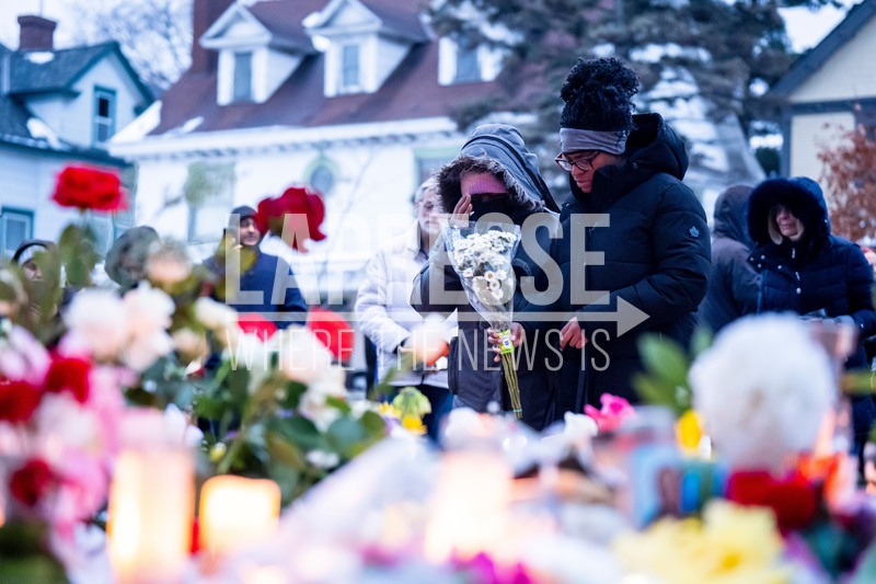 People pay their respects at a memorial honoring a woman who was fatally shot by an Immigration and Customs Enforcement officer the day before, near the site of the shooting in Minneapolis, Thursday, Jan. 8, 2026. (Christopher Katsarov/The Canadian Press via AP)