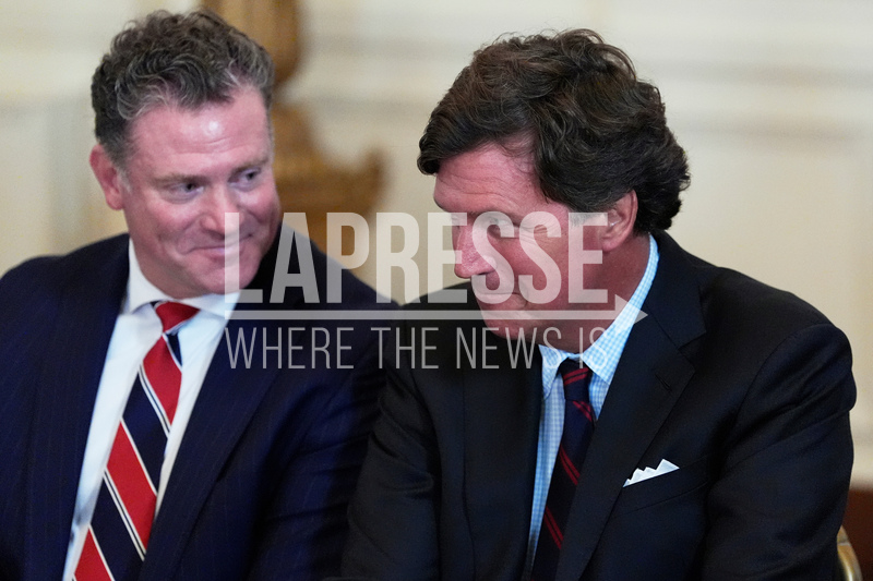 Tucker Carlson, right, attends a meeting with President Donald Trump and oil executives in the East Room of the White House, Friday, Jan. 9, 2026, in Washington. (AP Photo/Alex Brandon)