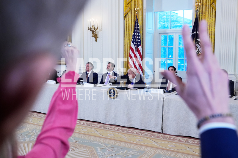 Presidente Trump parla durante un incontro con i dirigenti del settore petrolifero nella Sala Est della Casa Bianca.