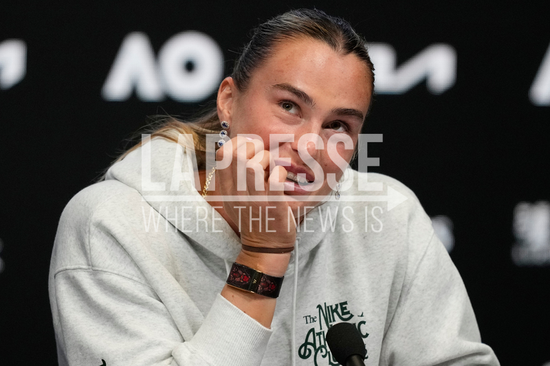 Aryna Sabalenka of Belarus reacts during a press conference ahead of the Australian Open tennis championship in Melbourne, Australia, Friday, Jan. 16, 2026. (AP Photo/Aaron Favila)