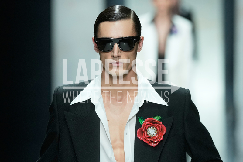 A model wears a creation as part of the Dolce & Gabbana Fall/Winter 2026-2027 Men\'s collection presented in Milan, Italy, Saturday, Jan. 17, 2026. (AP Photo/Luca Bruno)