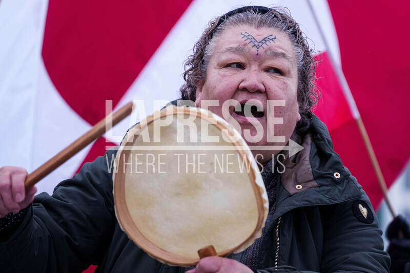 An Inuit woman sings a national song during a protest against Trump's policy towards Greenland in front of the US consulate in Nuuk, Greenland, Saturday, Jan. 17, 2026. (AP Photo/Evgeniy Maloletka)