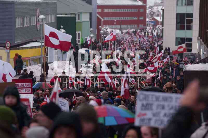 A crowd walks to the US consulate to protest against Trump's policy towards Greenland in Nuuk, Greenland, Saturday, Jan. 17, 2026. (AP Photo/Evgeniy Maloletka)