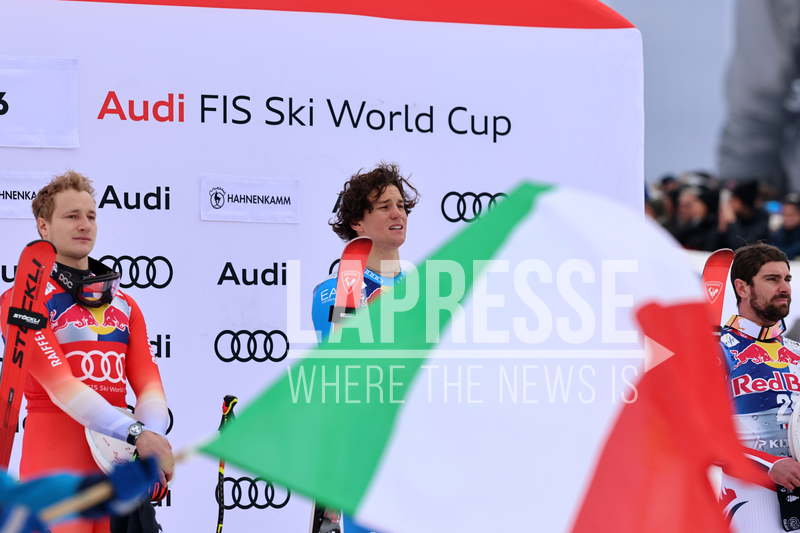 Italy's Giovanni Franzoni, center, winner of men's alpine ski World Cup downhill, poses on podium with second placed Switzerland's Marco Odermatt, left, and third placed France's Maxence Muzaton in Kitzbuehel, Austria, Saturday, Jan. 24, 2026. (AP Photo/Marco Trovati)