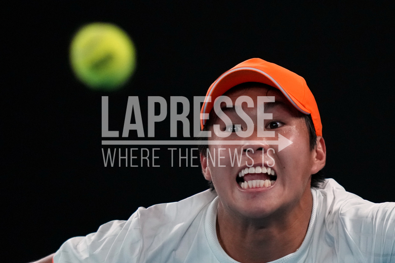 Learner Tien of the U.S. plays a forehand return to Alexander Zverev of Germany during their quarterfinal match at the Australian Open tennis championship in Melbourne, Australia, Tuesday, Jan. 27, 2026. (AP Photo/Aaron Favila)