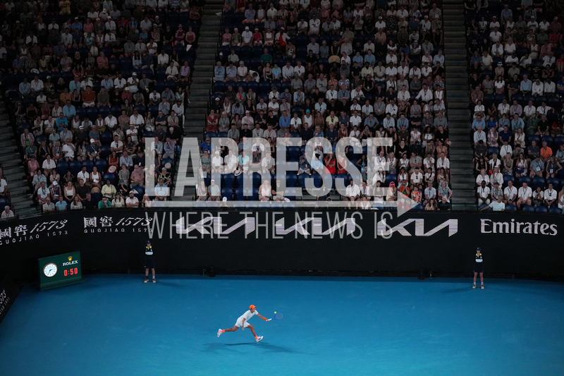 Learner Tien of the U.S. plays a forehand return to Alexander Zverev of Germany during their quarterfinal match at the Australian Open tennis championship in Melbourne, Australia, Tuesday, Jan. 27, 2026. (AP Photo/Dita Alangkara)