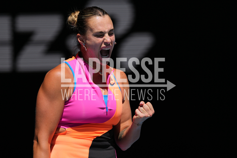Aryna Sabalenka of Belarus reacts during her quarterfinal match against Iva Jovic of the U.S at the Australian Open tennis championship in Melbourne, Australia, Tuesday, Jan. 27, 2026. (AP Photo/Aaron Favila)