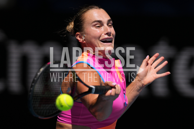 Aryna Sabalenka of Belarus plays a forehand return to Iva Jovic of the U.S during their quarterfinal match at the Australian Open tennis championship in Melbourne, Australia, Tuesday, Jan. 27, 2026. (AP Photo/Aaron Favila)