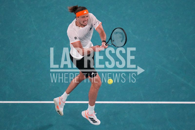 Alexander Zverev of Germany plays a backhand return to Learner Tien of the U.S. during their quarterfinal match at the Australian Open tennis championship in Melbourne, Australia, Tuesday, Jan. 27, 2026. (AP Photo/Dita Alangkara)