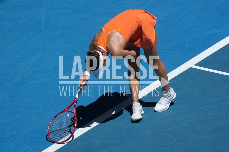 Iva Jovic of the U.S. reacts during her quarterfinal match against Aryna Sabalenka of Belarus at the Australian Open tennis championship in Melbourne, Australia, Tuesday, Jan. 27, 2026. (AP Photo/Asanka Brendon Ratnayake)