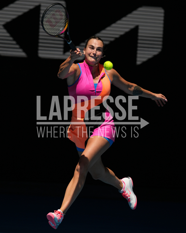 Aryna Sabalenka of Belarus plays a forehand return to Iva Jovic of the U.S. during their quarterfinal match at the Australian Open tennis championship in Melbourne, Australia, Tuesday, Jan. 27, 2026. (AP Photo/Dar Yasin)