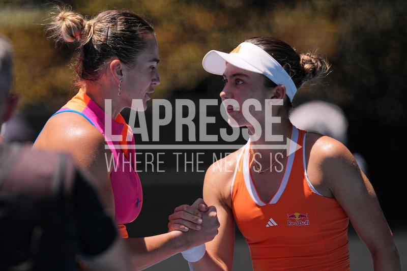 Aryna Sabalenka, left, of Belarus is congratulated by Iva Jovic of the U.S. following their quarterfinal match at the Australian Open tennis championship in Melbourne, Australia, Tuesday, Jan. 27, 2026. (AP Photo/Dar Yasin)