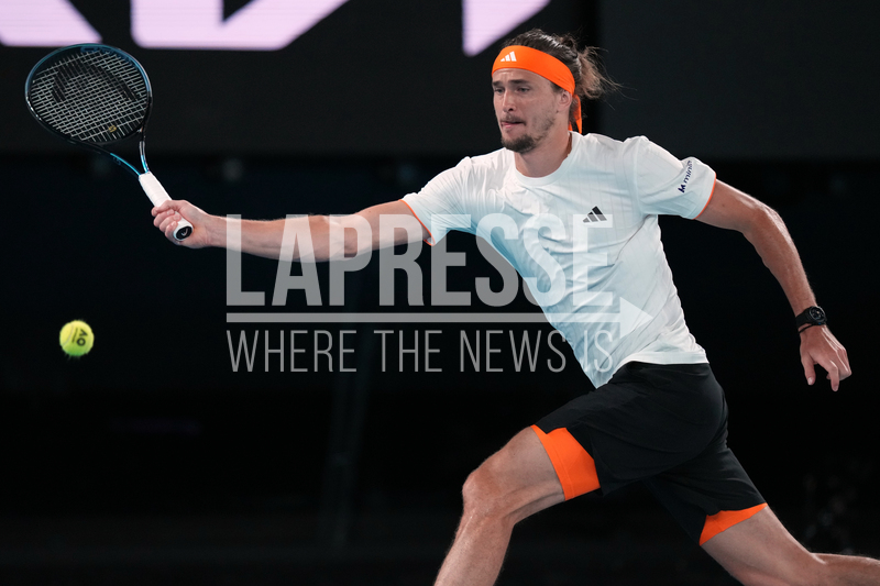 Alexander Zverev of Germany plays a forehand return to Learner Tien of the U.S. during their quarterfinal match at the Australian Open tennis championship in Melbourne, Australia, Tuesday, Jan. 27, 2026. (AP Photo/Aaron Favila)