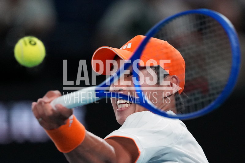 Learner Tien of the U.S. plays a forehand return to Alexander Zverev of Germany during their quarterfinal match at the Australian Open tennis championship in Melbourne, Australia, Tuesday, Jan. 27, 2026. (AP Photo/Asanka Brendon Ratnayake)