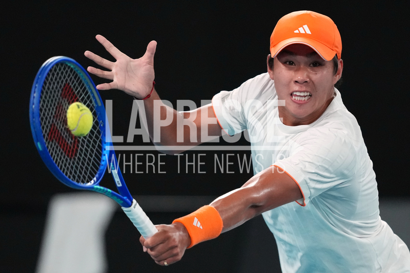 Learner Tien of the U.S. plays a backhand return to Alexander Zverev of Germany during their quarterfinal match at the Australian Open tennis championship in Melbourne, Australia, Tuesday, Jan. 27, 2026. (AP Photo/Dar Yasin)