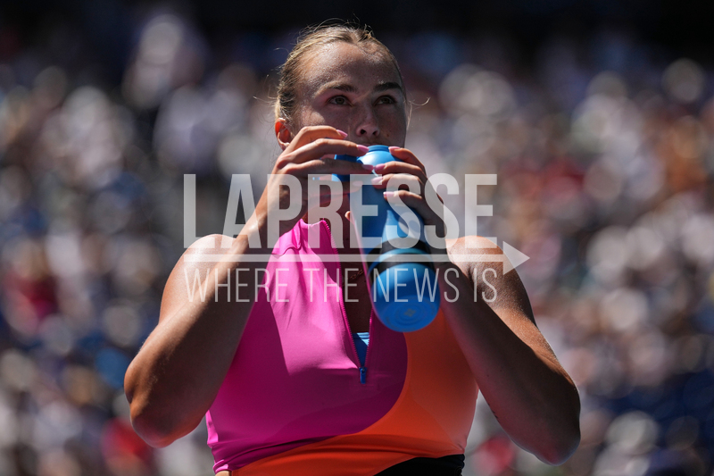 Aryna Sabalenka of Belarus takes a drink during her quarterfinal match against Iva Jovic of the U.S. at the Australian Open tennis championship in Melbourne, Australia, Tuesday, Jan. 27, 2026. (AP Photo/Dita Alangkara)
