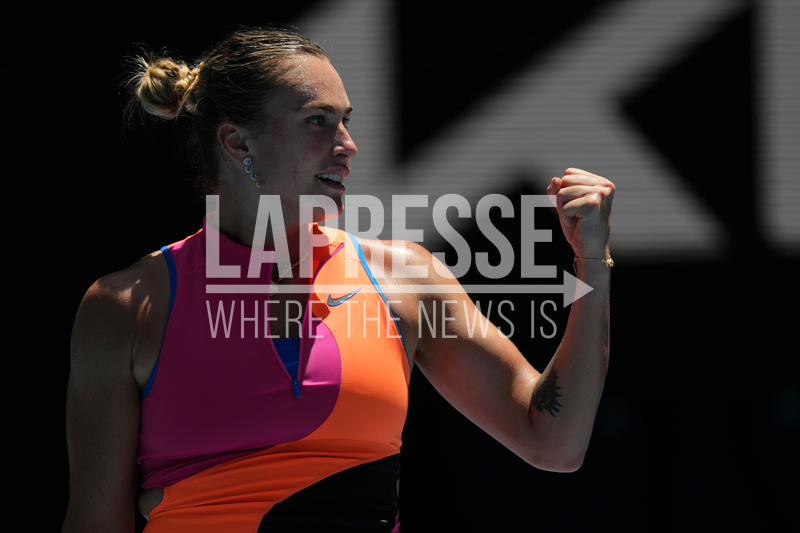 Aryna Sabalenka of Belarus reacts after defeating Iva Jovic of the U.S. in their quarterfinal match at the Australian Open tennis championship in Melbourne, Australia, Tuesday, Jan. 27, 2026. (AP Photo/Aaron Favila)