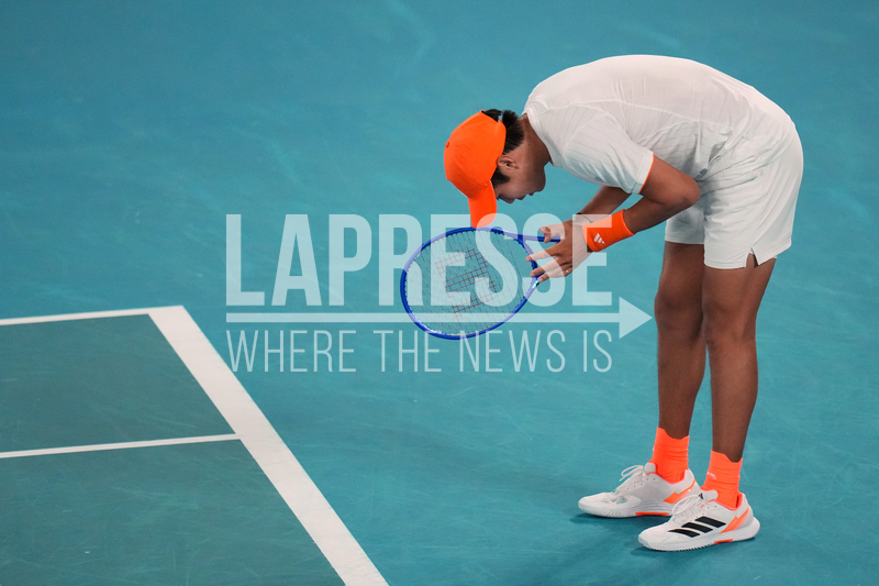 Learner Tien of the U.S. reacts during his quarterfinal match against Alexander Zverev of Germany at the Australian Open tennis championship in Melbourne, Australia, Tuesday, Jan. 27, 2026. (AP Photo/Dita Alangkara)