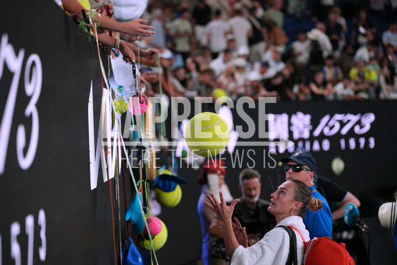 Aryna Sabalenka of Belarus signs autographs after defeating to Iva Jovic of the U.S. in their quarterfinal match at the Australian Open tennis championship in Melbourne, Australia, Tuesday, Jan. 27, 2026. (AP Photo/Dita Alangkara)