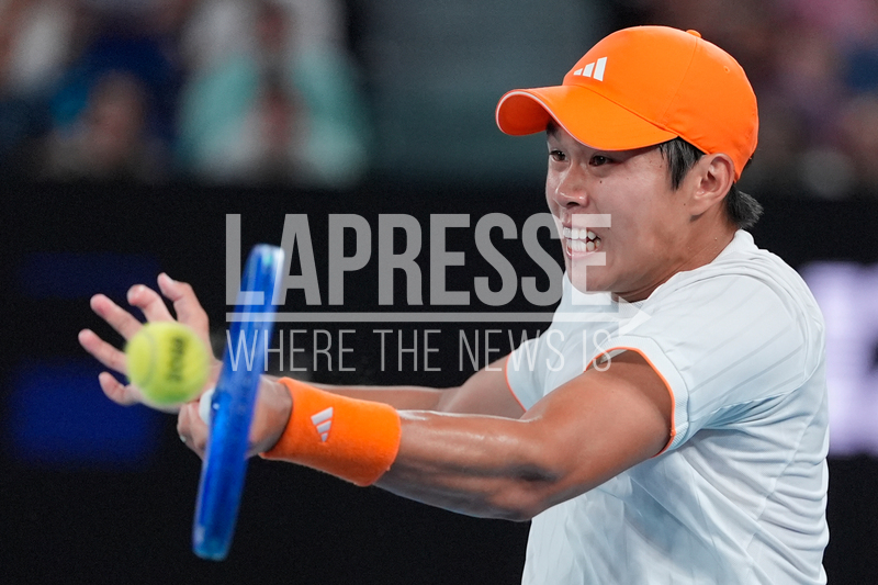 Learner Tien of the U.S. plays a forehand return to Alexander Zverev of Germany during their quarterfinal match at the Australian Open tennis championship in Melbourne, Australia, Tuesday, Jan. 27, 2026. (AP Photo/Asanka Brendon Ratnayake)