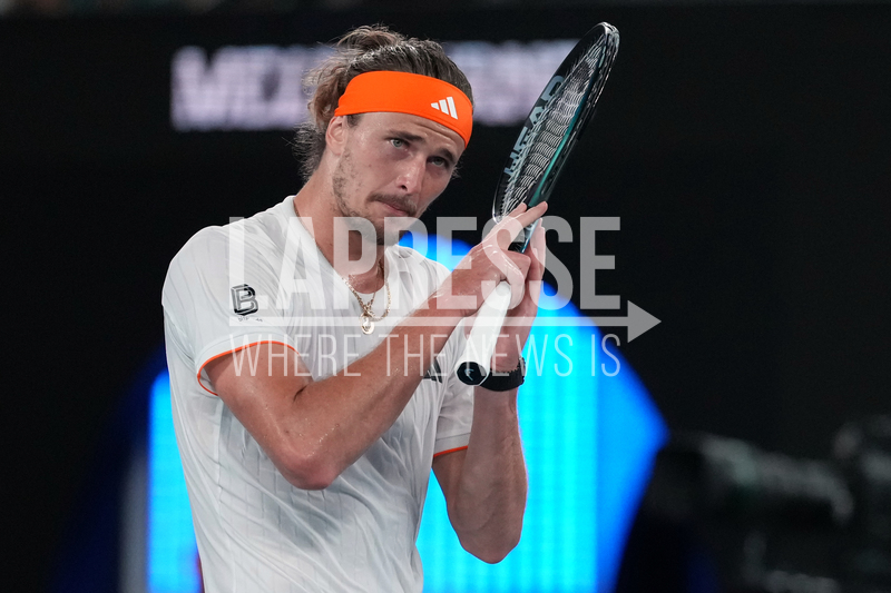 Alexander Zverev of Germany reacts during his quarterfinal match against Learner Tien of the U.S. at the Australian Open tennis championship in Melbourne, Australia, Tuesday, Jan. 27, 2026. (AP Photo/Asanka Brendon Ratnayake)