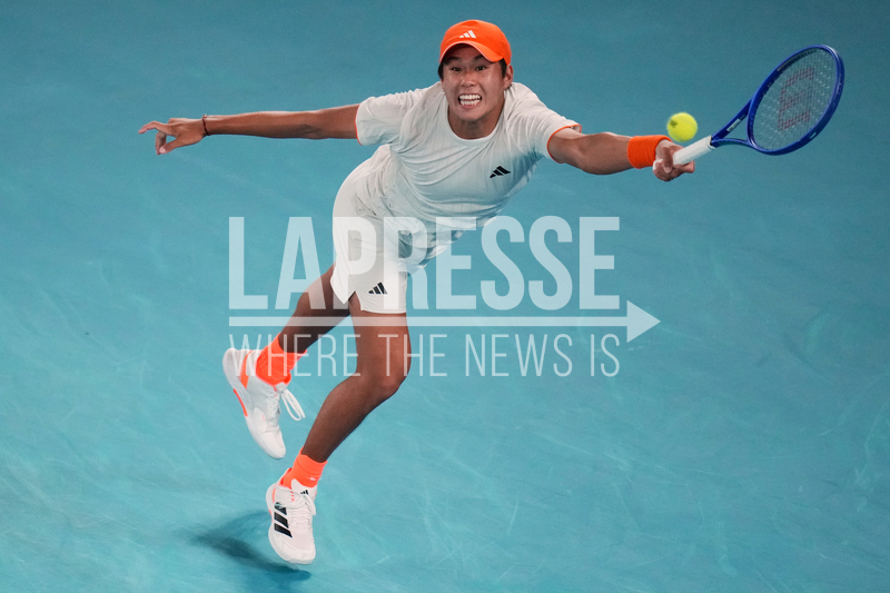 Learner Tien of the U.S. plays forehand return to Alexander Zverev of Germany during their quarterfinal match at the Australian Open tennis championship in Melbourne, Australia, Tuesday, Jan. 27, 2026. (AP Photo/Dita Alangkara)