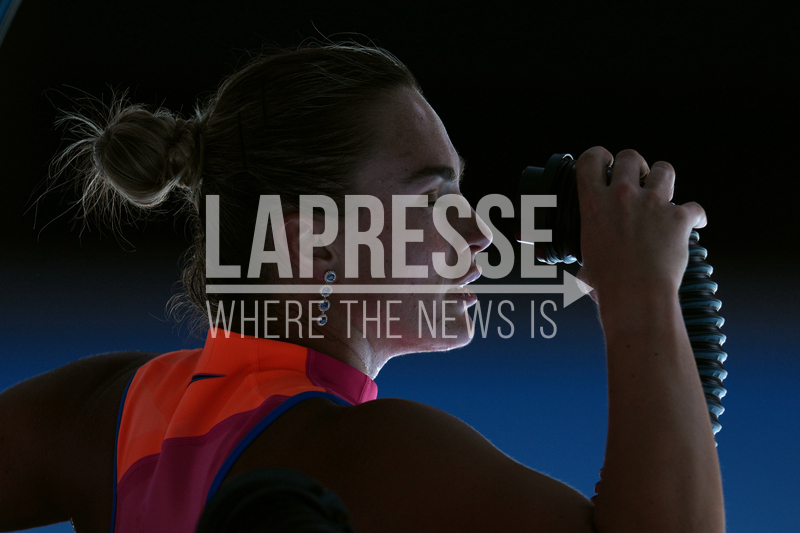 Aryna Sabalenka of Belarus blows cold air onto her face during her quarterfinal match against Iva Jovic of the U.S. at the Australian Open tennis championship in Melbourne, Australia, Tuesday, Jan. 27, 2026. (AP Photo/Dita Alangkara)