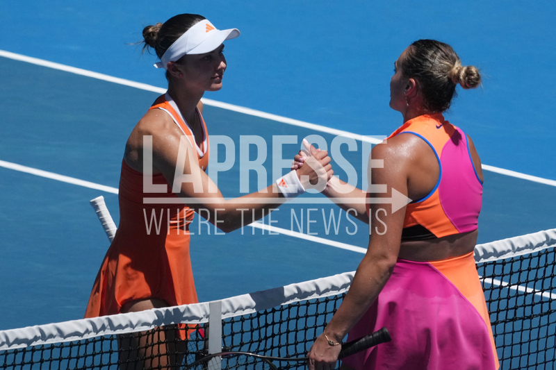 Aryna Sabalenka, right, of Belarus is congratulated by Iva Jovic, left, of the U.S. during their quarterfinal match at the Australian Open tennis championship in Melbourne, Australia, Tuesday, Jan. 27, 2026. (AP Photo/Asanka Brendon Ratnayake)