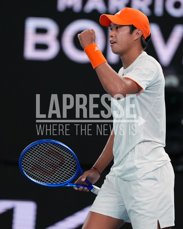 Learner Tien of the U.S. reacts during his quarterfinal match against Alexander Zverev of Germany during their quarterfinal match at the Australian Open tennis championship in Melbourne, Australia, Tuesday, Jan. 27, 2026. (AP Photo/Asanka Brendon Ratnayake)