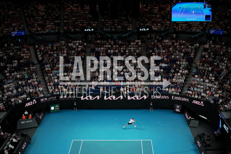 Alexander Zverev of Germany plays a backhand return to Learner Tien of the U.S. during their quarterfinal match at the Australian Open tennis championship in Melbourne, Australia, Tuesday, Jan. 27, 2026. (AP Photo/Dita Alangkara)
