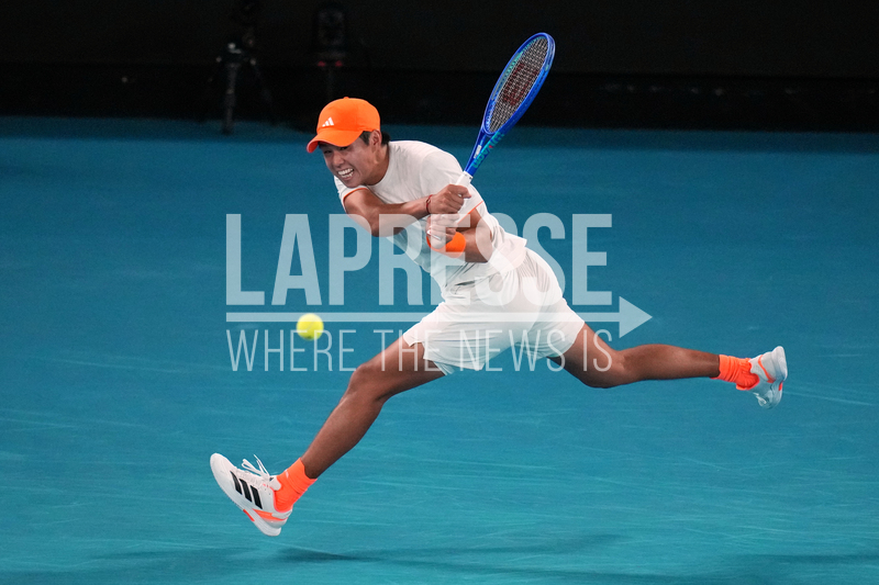 Learner Tien of the U.S. plays a backhand return to Alexander Zverev of Germany during their quarterfinal match at the Australian Open tennis championship in Melbourne, Australia, Tuesday, Jan. 27, 2026. (AP Photo/Dita Alangkara)