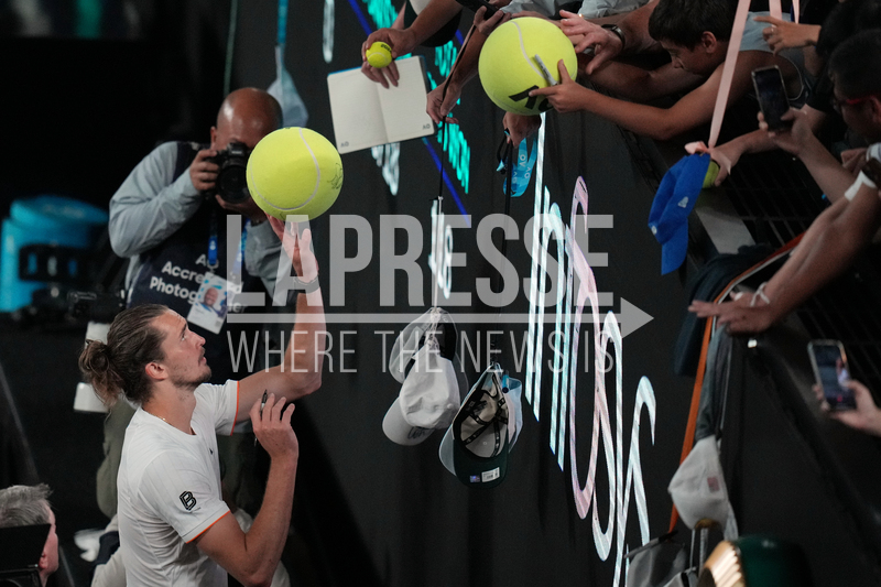 Alexander Zverev of Germany signs autographs for fans after defeating Learner Tien of the U.S. in their quarterfinal match at the Australian Open tennis championship in Melbourne, Australia, Tuesday, Jan. 27, 2026. (AP Photo/Dita Alangkara)