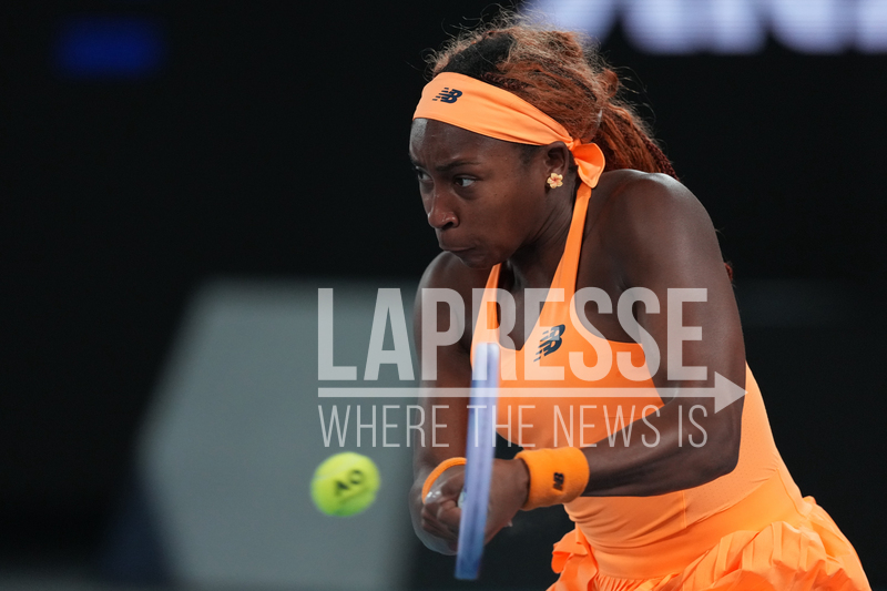 Coco Gauff of the U.S. plays a backhand return to Elina Svitolina of Ukraine during their quarterfinal match at the Australian Open tennis championship in Melbourne, Australia, Tuesday, Jan. 27, 2026. (AP Photo/Dita Alangkara)