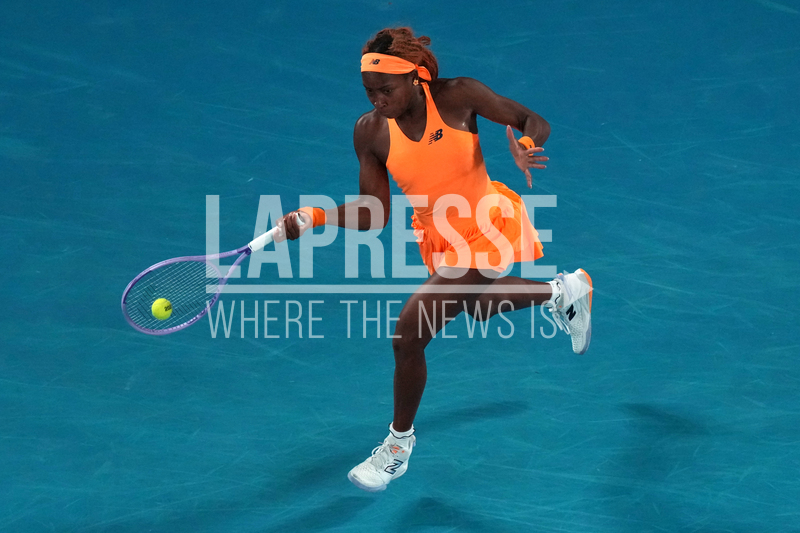 Coco Gauff of the U.S. plays a forehand return to Elina Svitolina of Ukraine during their quarterfinal match at the Australian Open tennis championship in Melbourne, Australia, Tuesday, Jan. 27, 2026. (AP Photo/Aaron Favila)