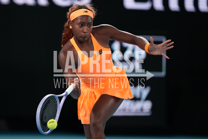 Coco Gauff of the U.S. plays a forehand return to Elina Svitolina of Ukraine during their quarterfinal match at the Australian Open tennis championship in Melbourne, Australia, Tuesday, Jan. 27, 2026. (AP Photo/Dar Yasin)