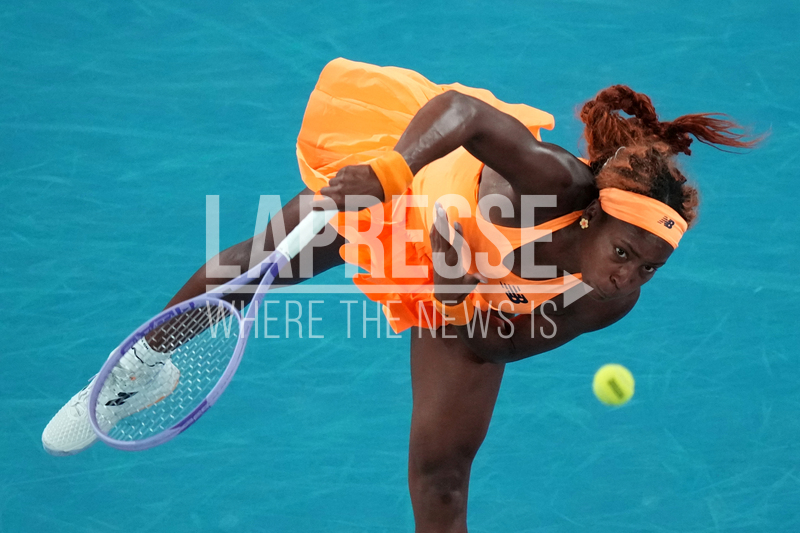 Coco Gauff of the U.S. serves to Elina Svitolina of Ukraine during their quarterfinal match at the Australian Open tennis championship in Melbourne, Australia, Tuesday, Jan. 27, 2026. (AP Photo/Aaron Favila)