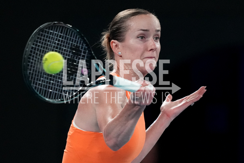 Elina Svitolina of Ukraine plays a forehand return to Coco Gauff of the U.S. during their quarterfinal match at the Australian Open tennis championship in Melbourne, Australia, Tuesday, Jan. 27, 2026. (AP Photo/Dar Yasin)
