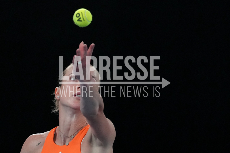 Elina Svitolina of Ukraine serves to Coco Gauff of the U.S. during their quarterfinal match at the Australian Open tennis championship in Melbourne, Australia, Tuesday, Jan. 27, 2026. (AP Photo/Asanka Brendon Ratnayake)