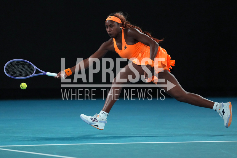 Coco Gauff of the U.S. plays a forehand return to Elina Svitolina of Ukraine during their quarterfinal match at the Australian Open tennis championship in Melbourne, Australia, Tuesday, Jan. 27, 2026. (AP Photo/Dita Alangkara)