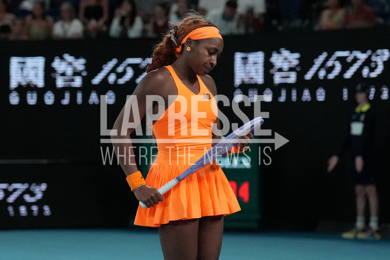 Coco Gauff of the U.S. reacts during her quarterfinal match against Elina Svitolina of Ukraine during their quarterfinal match at the Australian Open tennis championship in Melbourne, Australia, Tuesday, Jan. 27, 2026. (AP Photo/Dar Yasin)