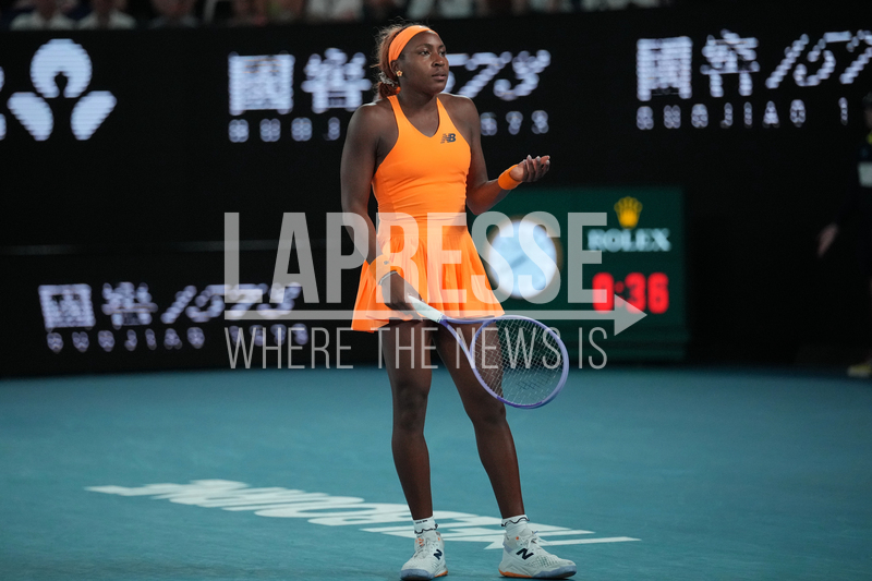 Coco Gauff of the U.S. reacts during her quarterfinal match against Elina Svitolina of Ukraine during their quarterfinal match at the Australian Open tennis championship in Melbourne, Australia, Tuesday, Jan. 27, 2026. (AP Photo/Dita Alangkara)